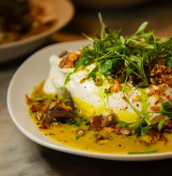 charred tomato–porcini curry cream, minchi aioli, fried curry leaves - Lemongrass & lime BC prawns, pipinna salad with avocado, spring shoots, radish, mustard‑coconut cream, chili, dill